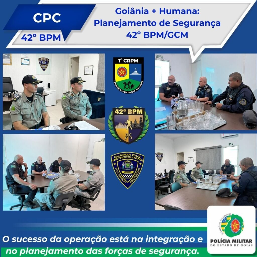 Na manhã desta sexta-feira, 17 de outubro, ocorreu uma importante reunião no Comando Geral da Guarda Civil Metropolitana, localizado na Avenida Nazareno Roriz, Vila Santa Tereza, Goiânia – GO. O Comandante do 42º BPM, TC PM Jorge, e o Subcomandante, MAJ PM Macedo, se juntaram ao Subcomandante da Guarda Civil Municipal (GCM) e ao Comandante da 5ª Unidade Regional da GCM. O encontro foi solicitado pelo Comandante do Policiamento da Capital e teve como objetivo o planejamento das ações de segurança para o evento “Goiânia + Humana”, que ocorrerá nos dias 17, 18 e 19 de outubro, na Praça da Feira do Conjunto Vera Cruz 2, na nossa região aqui em Goiânia.