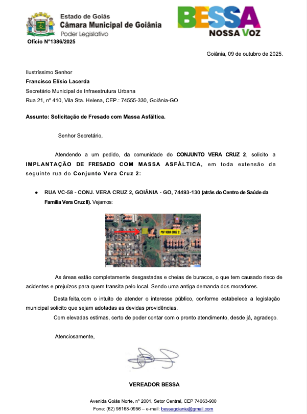 Prefeitura de Goiânia atende solicitação do Vereador Bessa e anuncia melhorias para o Conjunto Vera Cruz 2 e região